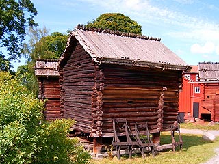 A millió híd egyikén kimegyünk a szárazföldre, végigslattyogunk a Freds-gatan-on, futtában megcsodáljuk a Királyi Drámai Színház díszes épületét, elmegyünk megint a Jakobinusok vörösre festett temploma mellett, átvágunk a Kungsträdsgaarden-en (emlékeztek még a kiejtésre?) és a kék nosztalgia-villamossal becserkésszük a Skanzent, amely a Királyi Vadaspark szigetén terül el. A főbejárattól gyalogos szerpentin vezet fel a sziklás dombtetőre, de teli hassal szabad választani a siklót is. Fönn aztán fenyves-nyírjes liget fogad, közte teresen lakóházak, gazdasági épületek garmadája . Mindig érdekelt más tájak, más népek műszaki hagyománya, házépítési mestersége, itt aztán kiélhetem magam. Itt van a tundrák népének lábakon álló gerendaháza, a nálunk hagyományos alapozást - gondolom - a hol keményre fagyó, hol láposra olvadó talaj miatt nem lehetne használni, a tömzsökös fa-lábakat viszont bizonnyal a fagyhatár alá, azaz a talaj állandóan fagyott rétegébe ássák be, így maradhat stabil. (Mi a fagyhatárt persze épp fordítva gondoljuk: az alatt a talaj már semmiképp sem fagy meg, ezért szilárd.) A tető szenzációsan van megoldva: a deszkázatra nyírkéreg csíkokat simítanak átlapolva, ez véd a víz ellen, a kérget meg a gerincen összecsapolt gerendák szorítják le a szél ellen (és még azt hisszük, hogy a több anyag előnyös tulajdonságait egyesítő kompozit szerkezeteket manapság találtuk fel!). Délebbre inkább a kő terem meg, ott kőből épülnek a falak, csak az ajtó-ablak készül fából. A tetőn itt is nyírkéreg a cserép, de nem gerendák, hanem az ereszlécre támaszkodó gyepszőnyeg védi a szél ellen és ráadásul kiválóan hőszigetel. A falak gerendái a sarkoknál átlapoltan tartják egymást, a gerendák közti réseket mohával, zuzmóval tömik meg szintén hőszgetelésileg. Itt is feltűnnek a hajókirándulás során megcsodált, vörösre pácolt deszka épületek a fehérre festett ajtókkal, ablakokkal, de látunk nádtetős építményt is. Itt nem ismerik a mi fonott gerincű nádtető készítési módszerünket, a kévéket itt is összecsapolt fa-koloncok szorítják le.