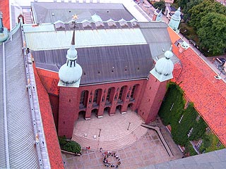 Visszaérünk az udvarra és azonnal megtámadjuk a tornyot. A jegyszedőnő erőtlen védekezését pár tizessel leszereljük és irány a magasság! Lesz mit kapaszkodnunk, a torony 106 m magas és azért pont ennyi, mert a koppenhágai Városháza tornya 105 méteres, a dolog lélektani hátterét ki-ki megfejteheti.A teljes magasságból 80 méter téglából rakott, ennek tetején építették fel valóban öles gerendákból a harangok lakását, a legtetején a város jelképe, a Tre Kronor /hármas korona/ hatalmas, aranyozott mása hirdeti Stockholm erejét, szilárd hitét. A főépület tömbjével épp csak sarkán érintkező, négyzet alaprajzú torony kettős falú és a két fal közén emelkedik a magassághoz képest egészen kímélősen a lépcső, néhol aprócska ablakon lehet ellenőrizni, hogy nem mentünk-e túl a torony csúcsán. A folyosó viszont olyan keskeny, hogy átlagos emberek is csak a fordulóknál kerülhetik ki egymást, napjaink jövő-menő emberáradatára nyilván nem számítottak az építésnél. Hogy falánk egyedek pórul ne járjanak a lejövetelkor, fenn a toronyban nincs büfé. Az ácsolt tető karzatáról a látvány - nem csak a magasság miatt - lélegzetelállító: Stockholm térképszerűen, mégis megfogható közelségben tárul ki a szemünk elé. Keresem a már ismert részleteket: itt az Óváros, a Királyi Vár, emerre a Központi Pályaudvar hatalmas, piszkosfehér épülete terül el szinte alattunk, ott messze azon a dombon van a Skanzen és a Városháza parkjában a szépen nyírt sövény furcsa arabeszkeket terít alánk.