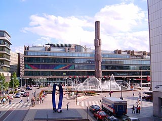 Az első benyomás az utcakép: olyan mint Pesten mondjuk a Bajcsi-Zsilinszky út. Háromemeletes házak, kétszer háromsávos út, közepes forgalom járdán és úttesten. Talán csak a tisztaság szembeszökő, meg hogy a házak fala nem vakolt, hanem vörös téglával borított. Megyünk két sarkot és keresztezzük Stockholm Váci utcáját, a Drottning-gatan-t, az elegáns üzletek sétálóutcáját. Itt aztán hömpölyög a tömeg, egymást érik a kirakatok, a keskeny utcán keresztbe feszített sodronyokról nemzeti zászlók tömege lóg lebegve az utca egész hosszában. Még két sarok és a modern Stockholm egyik központi helyén, a Sergels Torg-on állunk. A hosszúkás tér egyik oldalán a Kulturhuset fém-üveg palotája áll, a többi épület is modern, de nem magasabb négyszintesnél. A tér közepén egy jókora szökőkút, benne az álló hengerekből komponált obeliszk. A tér sarkában egy spanyol vendéglőbe ülünk le és eszünk valami finom, fűszeres tájjelegűt, Kati ajánlására pedig leöblítjük az itteni egyik könnyű sörrel, a Pripps Blaa-val. A fizetés itt sem az asztalnál történik, Kati meglátogatja a pénztárt és már mehetünk is.