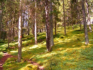 Ködre ébredünk, de színe van a ködnek, tehát nemsokára sütni fog. Megreggelizünk, Kati pakol elemózsiát és nekiindulunk. Mai célpontunk a Kindla magaslat, egy igazi skandináv öserdö, ahol Kati kollégáival már járt. Hamarosan letérünk az útról és elképesztően sima földúton folytatjuk a kocsizást. Földutat mondok, de finom gránit-őrleménnyel van felszórva, amin a tegnapi egésznapos eső dacára egyetlen pocsolyát nem lehet találni. Nándi mégis morog, mint a bolhás kutya, hogy milyen alantas helyekre kell a szuper VOLVO-val behajtania. Némi kevergés végén megállunk egy erdei parkolóban és nekiindulunk az ösvényen. Az egyemberes ösvény egy mohalepte minilápon visz át, pallókból épített járdán. Az ösvény aztán a lápba ömlő patak mentén kapaszkodik feljebb-feljebb és a patak ágyát és az ösvényt leszámítva itt is mindent belep a mohák sokféle szőnyege. Van itt a bársonyhoz hasonlító haragoszöld, máshol mimiatűr páfrányok dzsungele képez borsózöld szőnyeget, a napnak jobban kitett helyeken vékonyka szálak viselik apró gallérok sorát és így képeznek sápadt szürkészöld drapériát. A mohák színe még helyről helyre is más, gondolom a nedvesség és a nap mennyisége tesz ilyen csodákat.