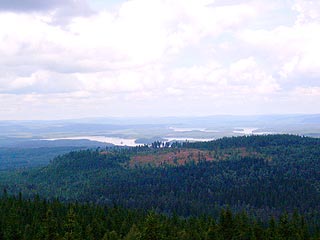 Találni itt mindent, ami egy erdőben szép: pár méter mély szakadékot, ahol a patak kőről kőre ugrálva apró vízeséseket alkot, kiszáradt, de még ki nem dőlt fenyőt, amely kopasz ágaival csontvázként áll, mohalepte, emberarcú sziklát, amely Walt Disney híres Hófehérke rajzfilmjének rémisztő erdei bolyongásához lehetne díszlet. Megint elválok a társaságtól, a Kindla magaslatra nem a legrövidebb úton megyek, hanem azon, amely egy tavacskát és egy lápot is érintve kapaszkodik fel . Az ösvényt nemigen lehet eltéveszteni, még a vak is eltájékozódhatna ebben az erdőben, hiszen a keményre taposott ösvény mellett a mohaszőnyeg olyan puha, vastag. Az ösvényeket narancssárga pöttyök jelzik a fák törzsén, nincs színezés, viszont minden elágazásnál útbaigazító fa-táblák segítenek tájékozódni. Nem nagy a kerülő, amit választottam, hamar elérem a tavat. Partja végig mocsarasan benőtt, csak a távolban látszik egy gerendákból ácsolt eső-beálló, ahol le lehet menni a tópartra. Az esőbeálló remek ácsmunka, egy 8-10 fős társaság lazán beférne. Odébb egy ágakból emelt gunyhó, oldalát műanyag ráccsal(?), azt mohával boritották, még kéménye is van, előtte a vízen egy csónak várja, hogy elkössék és a csinos szigetecskék valamelyikére evezzenek. Rájövök, mi olyan furcsa a tavon: szinte fekete a víz (gondolom a korhadó levelektől) és egyetlen madár, bogár, élőlény nem látszik közel-távol. A tó túlsó vége már a mocsár kezdete: a legszélén pár csenevész fenyő, néhányat már megfojtott a mocsár, bedőlt és törzse már nem, csak az ágai állnak ki az aljnövényzetből, a többi besüllyedt a mocsárba. Beljebb magasszálú fű (vagy sás?) lepi a terepet, középen már csak a gyanúsan hibátlan mohaszőnyeg jelzi, hogy itt senki sem jár. Van ebben a zölddel idilli szépségűre kendőzött mocsárban valami félelmetes: aki gyanútlanul belekeveredik, pórul járhat. Odébb, a hegyoldalban egy másik ösvény keresztezi az enyémet: van vagy 2 centi széles. Leülök, nézem a masírozó hangynépet, a nekik áthatolhatatlan őserdőnek számító mohába vágott és láthatóan karbantartott utacskát. Mesevilág ez: ha pár percre leülsz és az erdő neszekkel teli csendjét hagyod magadon átfolyni, már nem lep meg, hogy fa odvából, szikla üregéből manók, koboldok bújnak elő és a süppedő mohán nyomot sem hagyva tipegnek áfonyát gyűjtögetve, minden leeső tűlevélre ijedten rezdülve. Vándor, ne riaszd el őket, az erdő lelkét, a magad békéjét találhatod meg ezekben a befelé forduló, csöndes pillanatokban.