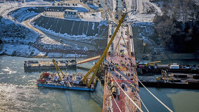 Összeért az új komáromi Duna-híd. A délelőtt során beemelték a helyére a hídpálya utolsó elemét is. A téli leállás miatt a befejező munkálatokat jövő tavasszal végzik el, és akkor kezdődik a híd műszaki átadása.